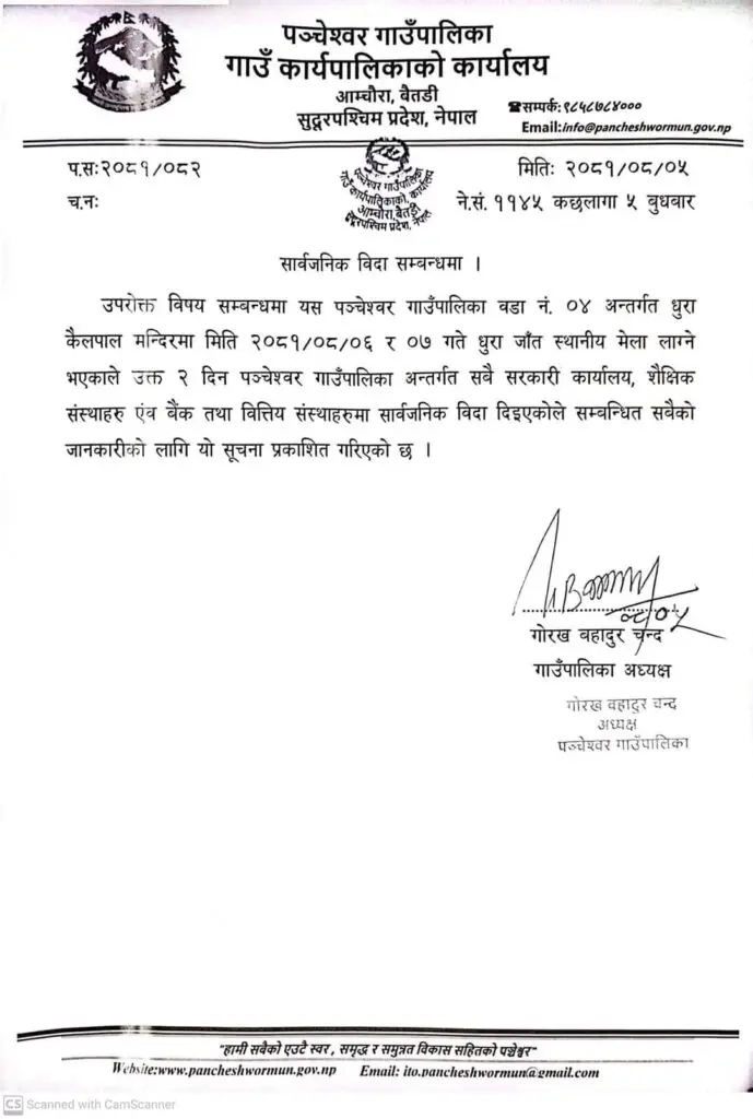 बैतडीःबैतडीको पञ्चेश्वरमा आज र भोलि सार्वजनिक बिदा दिएको छ।