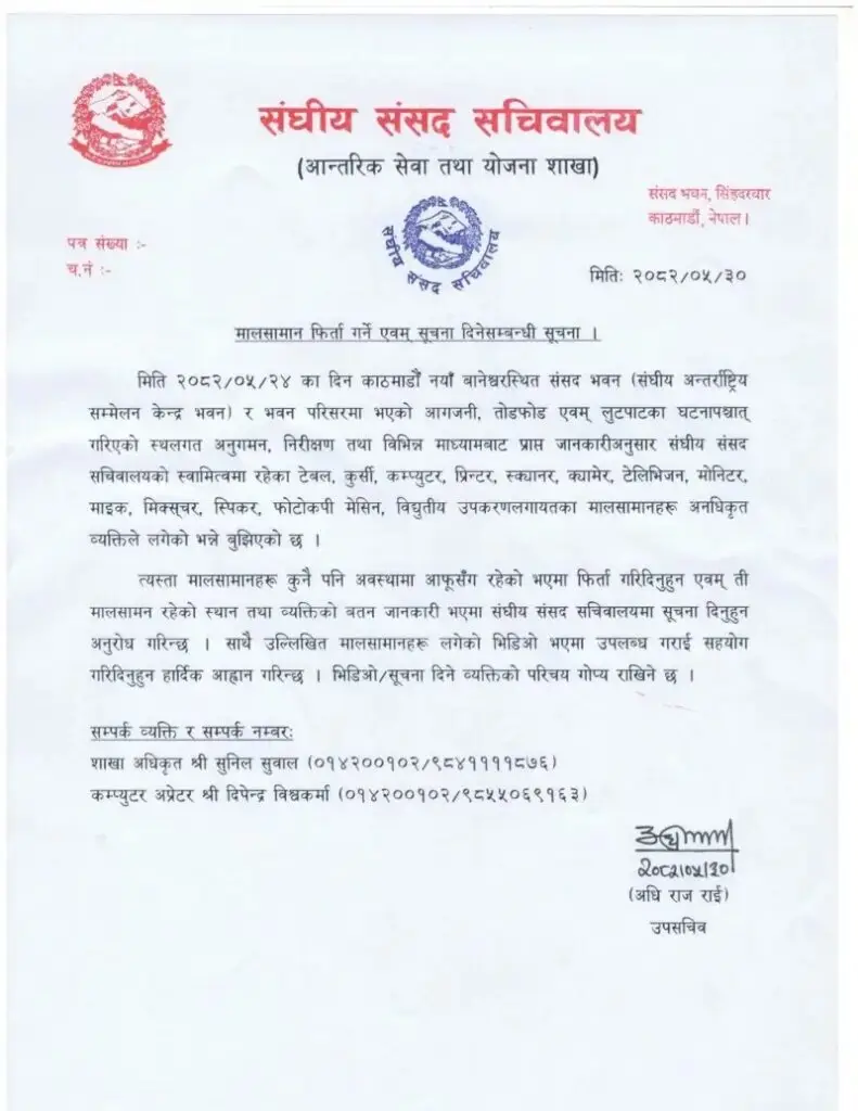 काठमाण्डौं –सङ्घीय संसद् सचिवालयले ‘जेन–जी’ प्रदर्शनका क्रममा संसद् भवनबाट लुटपाट भएका सामान फिर्ता गर्न आग्रह गरेको छ ।